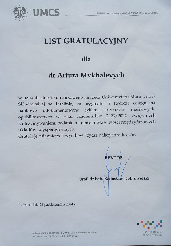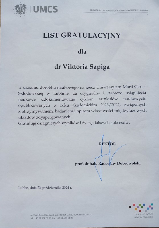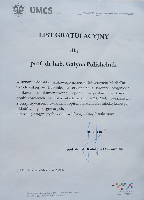 Науковці університету – завідувачка кафедри технології молока і молочних продуктів, професорка Галина Поліщук, асистентка кафедри процесів і апаратів Вікторія Сапіга та аспірант кафедри технології молока і молочних продуктів Артур Михалевич одержали вітальні листи від ректора Університету Марії Кюрі-Склодовської в Любліні (Польща), професора Радослава Добровольського щодо визнання їхніх оригінальних і творчих наукових досягнень, підтверджених серією спільних із польськими науковцями наукових статей, пов’язаних із описом властивостей міжфазних дисперсних систем.